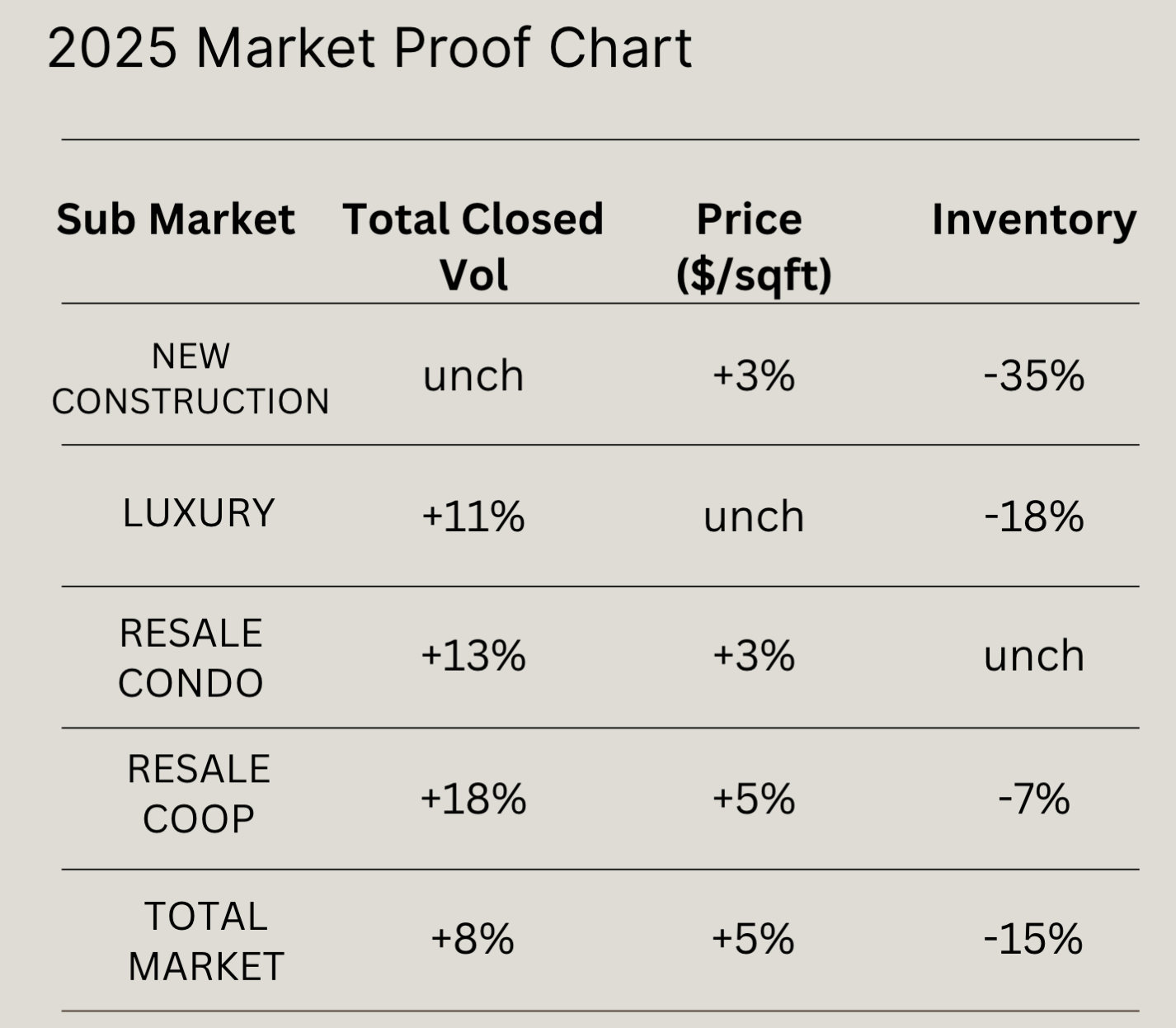 As we move into the holiday season, the NYC real estate market has officially hit its year-end slowdown. Activity is quieter across the board—except for the deals racing to close before December 31st. But is 2025 shaping up to be an inflection year? The data suggests yes. Every submarket is showing lower inventory, higher closed volume, and modest price appreciation. The year-over-year momentum in new development and the luxury segment—two categories that typically lead the broader market—is especially striking.